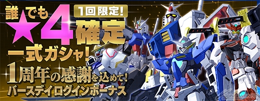 1回限定で誰でも★4確定一式ガシャが引けるほか、バースデイログインボーナスで【期限付き】★4一式ガシャチケットが1枚プレゼントされる。