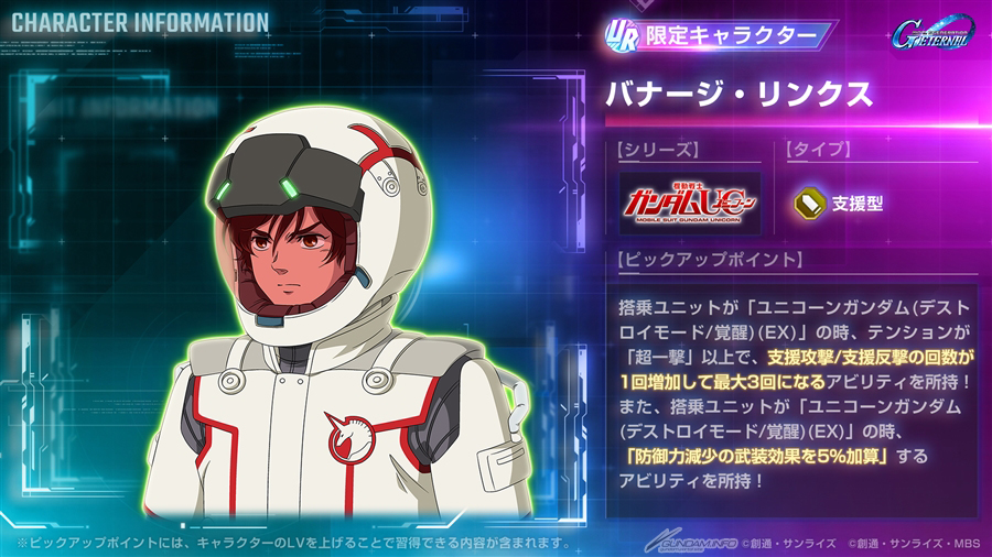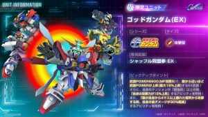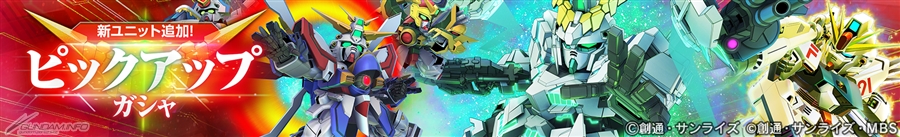 ● ピックアップガシャにUR「ユニコーンガンダム(デストロイモード/覚醒)(EX)」/UR「バナージ・リンクス」、UR「ゴッドガンダム(EX)」/UR「ドモン・カッシュ」、UR「ガンダムF91(EX)」/UR「シーブック・アノー」が登場!