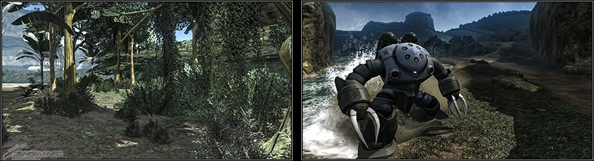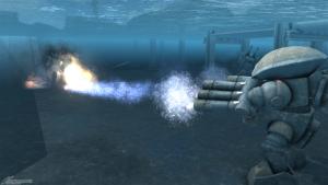 「密林地帯」の水中は、港湾基地の水中より少し暗く、見通しが悪くなっている。両側の壁は、歩いては登りにくいが、スラスターでは基本どこでも登ることが可能。