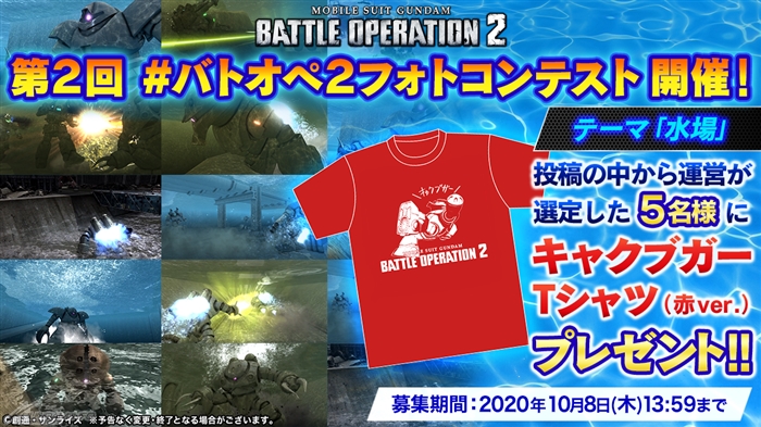 今回は水中戦実装にちなんで「水場」をテーマに、バトオペ2プレイ中のベストショットを大募集。受賞者には「キャクブガーTシャツ(赤)」がプレゼントされるので、この機会にバトオペ2で思い出を残そう。