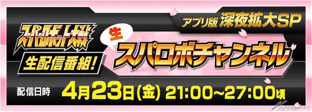 人気ゲームシリーズ「スーパーロボット大戦」の最新情報をお届けする生配信番組「生スパロボチャンネル[アプリ版]深夜拡大SP」が、4月23日(金)21:00より配信されることが決定した。