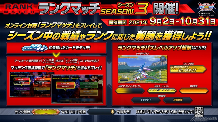 9月2日(木)から、プレイ状況やシーズン終了時のランクに応じてアイテム解放チケットやGPが獲得できる「ランクマッチシーズン3」が開催される。