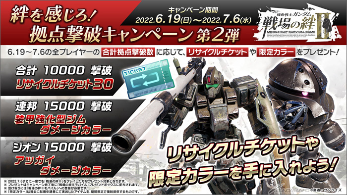 期間中、全プレイヤーの合計拠点撃破数に応じてリサイクルチケットや限定カラーをプレゼント。
