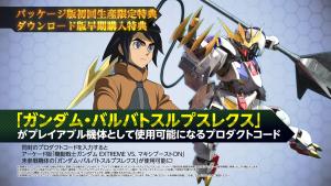 さらに、パッケージ版初回生産限定特典またはダウンロード版早期購入特典で使用可能になる「ガンダム・バルバトスルプスレクス」を含めると、全186機体が使用可能となる。 ※後日配信を行う可能性がございます。予めご了承ください。