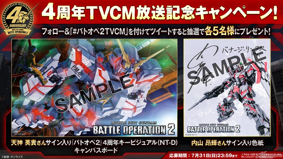 バトオペ2公式Twitter(@gundambattleope)をフォローの上、ハッシュタグ「#バトオペ2TVCM」をつけてツイートすると、「天神英貴さんサイン入り『バトオペ2』4周年キービジュアル(NT-D)キャンバスボード」と「内山昂輝さんサイン入り色紙」が抽選で各5名にプレゼントされる。