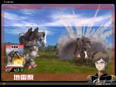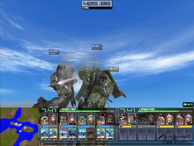 このゲームは編制を決めてプレイをスタートすると、3Dのモビルスーツがバトルを繰り広げる。しかも、戦況を見て、クリックひとつで特殊アイテムを使用を発動できる。
