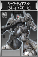 ジオン側報酬 ガンタンク 【鹵獲機】 HP:3170 回避: 4 装甲:48 盾なし 速度:15m/s 移動:汎用(車両) ボップ・ミサイル 命中:57 威力: 70 間隔:0.40秒 射程: 40m~275m 移動攻撃:○ 120mmキャノン砲 命中:63 威力:122×2 間隔:3.50秒 射程:275m~675m 移動攻撃:× |