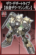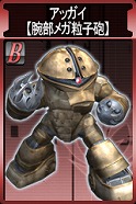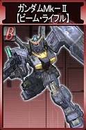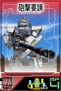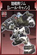 ジオン側報酬 ガンキャノン【鹵獲機】 HP:3410 回避:10 装甲:46 盾なし 速度:21m/s 移動:汎用(歩行) 頭部バルカン砲 命中:57 威力: 50×2 間隔:0.30秒 射程: 0m~125m 移動攻撃:○ ビーム・ライフル 命中:66 威力:147 間隔:1.70秒 射程: 40m~275m 移動攻撃:○ キャノン砲 命中:60 威力:126×2 間隔:3.50秒 射程:275m~675m 移動攻撃:× |
