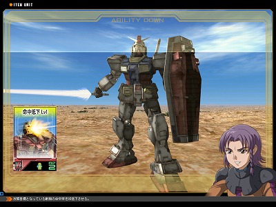 ジオン側報酬 陸戦型ガンダム【鹵獲機】 HP:3310 回避:20 装甲:46 盾HP:275 速度:25m/s 移動:地上(歩行) ビーム・サーベル 命中:69 威力:131 格闘攻撃 射程: 0m~ 40m 移動攻撃:× 100mmマシンガン 命中:60 威力: 75 間隔:0.40秒 射程: 40m~275m 移動攻撃:○ 胸部バルカン砲 命中:60 威力: 55 間隔:0.30秒 射程: 40m~125m 移動攻撃:○ |