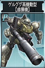 連邦側報酬 ゲルググ高機動型【鹵獲機】 HP:3700 回避:27 装甲:44 盾なし 速度:26m/s 移動:汎用(歩行) ビーム・ナギナタ 命中:74 威力:134 格闘攻撃 射程: 0m~ 40m 移動攻撃:× ロケット・ランチャー 命中:75 威力:208 間隔:2.20秒 射程: 40m~475m 移動攻撃:○ 搭載:19 |