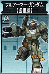 ジオン側報酬 フルアーマー・ガンダム【鹵獲機】 HP:4260 回避:17 装甲:55 盾なし 速度:22m/s 移動:汎用(歩行) 頭部バルカン砲 命中:66 威力: 54×2 間隔:0.30秒 射程: 0m~125m 移動攻撃:○ 2連装ビーム・ガン 命中:75 威力:112×2 間隔:1.70秒 射程: 40m~275m 移動攻撃:○ キャノン砲 命中:69 威力:252 間隔:3.50秒 射程:275m~675m 移動攻撃:× 搭載:22 |