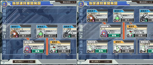 「ボール」を開発する場合、その前期型にあたる「先行量産型ボール」が開発済みであれば、必要な開発ポイントを軽減できる。また「ボール」を開発した場合、次の技術レベルの「ジムキャノン」の開発に必要なポイントを軽減することができる。