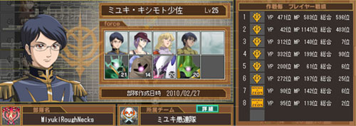 予選ではなんと1位勝ち抜け、本戦では栄えある1番機として登場した。 ただし、その後は特に見せ場もなく退場してしまったが(涙) 回避重視の壁隊長の方が予選での生存率は高いのだが、 本戦に登場した時に盛り上がるのは命中重視の射撃隊長。 憎いガンダム系の機体を一撃必殺した時など、本当にスカッとする。 ただし、こちらは必然的に被弾率も高く、本戦に残るのが難しい。 大規模任務に向けて隊長のスキルや編成を変えるのも重要な戦略だ。 我が隊の奮戦も虚しく、今週は敗れてしまった大規模任務。 というか、戦ってるのは敵も味方もほとんどが元ジオン兵ばかり。 かつての戦友たちと、なぜ殺し合わなければならないのか!? 戦争という言葉では片づけられない、あまりにも哀しい現実。 ていうか、元連邦軍の兵たちは一体何をやっているのかね? ミユキ隊長、総合2位を獲得! そして、こちらの画像をごらんください! 8週目にして、ついに個人総合ランキング2位を獲得いたしました!