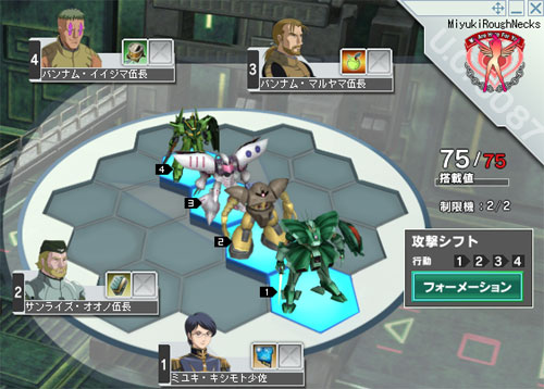 大型シールドの防御力は、かのΖガンダムをも凌駕する。 1番機としては最高のスペックを持つこの機体を乗りこなすため、 ミユキ隊長のスキルも大幅に変更した。 デフォルトで用意された隊長の成長タイプも便利なのだが、 真剣にランキングを狙うのであれば断然カスタマイズした方がいい。 2番機は前回も解説した、ゴッグによる「疑似遅延編成」。 そして攻撃役の3番機も前回と同じくキュベレイなのだが、 今回は1番機にHPの高いハンマ・ハンマを配置していることにより、 前回と違って1番機と3番機の間にHPの高低差ができる。 これは疑似遅延編成で3番機以降の進軍を遅らせるだけでなく、 「高HP狙い」の敵を最初からハンマ・ハンマに引きつけることができ、 より盤石の態勢で後衛が攻撃することが可能となるのだ。 最前線ともなると敵はかなり複雑な編成を組んでくるので、 このように、搭載値による「強弱」とHPの「高低」をつけることで 敵の全ての思考パターンに対応することが望ましい。 ちなみに、先週紹介した部下パイロットたちは 多方面からあまりにも「キモい」と評判だったので、元に戻した。 というわけで、今週はここまで。 ハマーン様もいらっしゃって、ようやくティターンズの管理下から 解放されるかと思ったら、引き続き同盟関係なんだって(笑) 早く三つ巴の戦いに持ち込みたいぞ! 次週、「ダカールの日」をお楽しみに。