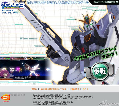 ガンダムネットワークオペレーション 3 ジャンル : 多人数参加型ネットワーク戦略ゲーム(MMOSLG) 対応OS : WindowsXP/Vista/7(Windows7は32bit版、64bit版とも対応) 発売元 : 株式会社バンダイナムコオンライン 月額利用料: クレジットカード決済 1ヶ月1,155円(税込) セブンイレブン決済・WebMoney決済・ドコモケータイ払い 3ヶ月3,780円(税込) |