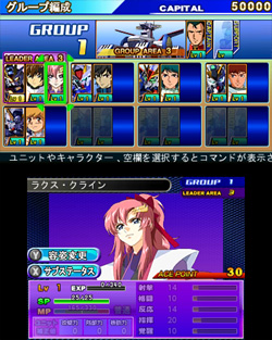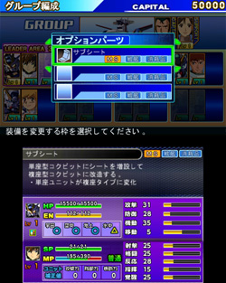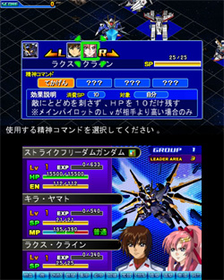 サブシートに「ラクス・クライン」を乗せると、ステータス画面には2人のキャラが表示され、サブシートの効果によりラクスの分の精神コマンドも使えるようになる。
