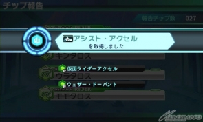 「仮面ライダーアクセル」のチップを報告すると、報告済みの「ウェザー・ドーパント」のチップと合わさり、新フォース『アシスト・アクセル』を取得!『アシスト・アクセル』をセットしているキャラは、バトル中に「仮面ライダーアクセル」をアシストキャラとして召喚できる!