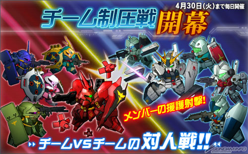 バンダイナムコオンラインが「Yahoo!ゲーム」にて提供中の基本無料ブラウザゲーム「SDガンダムオペレーションズ」では、本日4月24日(水)正午より新報酬システムを実装した「チーム制圧戦」が開幕し、さらに「ガンダムバトルコロシアム」と「獲得PPアップキャンペーン」、「11連ガシャ★3以上1枚保証キャンペーン」もスタートした。