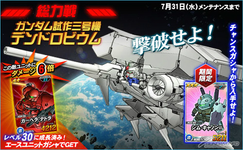 「ガンダム試作3号機 デンドロビウム」を倒した際に引くことができるチャンスガシャには、「ジム・キャノンII」を獲得できるチャンスがあるほか、エースユニットガシャには「ガンダム試作3号機 デンドロビウム」に対し6倍の攻撃力を発揮する「ガーベラ・テトラ」が追加される。