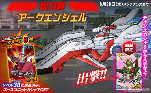 「アークエンジェル」を倒した際に引くことができるチャンスガシャには、「バスターガンダム」を獲得できるチャンスがあるほか、エースユニットガシャには「アークエンジェル」に対し6倍の攻撃力を発揮する「イージスガンダム」が追加される。
