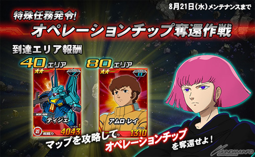 同じく本日より8月21日(水)までの期間限定で開催される特殊任務「オペレーションチップ奪還作戦」では、開催期間中に「特殊任務マップ」に登場する強力な敵を倒すことで「オペレーションチップ」を獲得することができる。