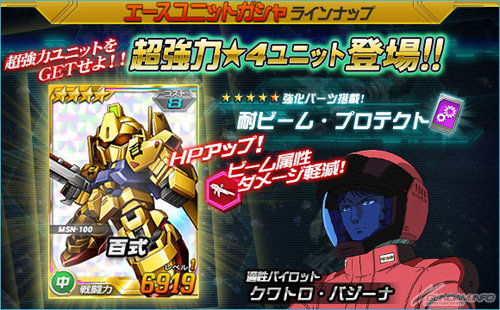 「★4 百式」は、強化パーツ「耐ビーム・プロテクト」を搭載している。この超強力な機体をぜひとも手に入れよう。