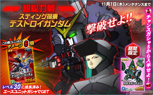 「スティング搭乗デストロイガンダム」を倒した際に引くことができるチャンスガシャSには、「カオスガンダム(MS)」を獲得できるチャンスがあるほか、エースユニットガシャには「スティング搭乗デストロイガンダム」に対し6倍の攻撃力を発揮する「デスティニーガンダム」が追加される。