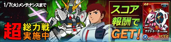 「アムロ搭乗νガンダム」を倒した際に引くことができるチャンスガシャSには、超強力なユニット「★4 フリーダムガンダム」、「★4 シャア専用ゲルググ」、「★4 ガンダム試作一号機フルバーニアン」、「★4 百式」を獲得できるチャンスがあるほか、エースユニットガシャには「アムロ搭乗νガンダム」に対し3倍の攻撃力を発揮する「★2 サザビー」と、「νガンダム」に対し3倍の攻撃力を発揮する「★2 ヤクト・ドーガ(ギュネイ専用機)」が追加された。