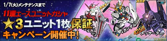 また、エースユニットガシャラインナップには強力なユニット「★3 νガンダム」が追加されたほか、過去の総力戦でチャンスガシャの期間限定報酬となっていたユニットも再登場。さらに、お得な「11連ガシャ★3ユニット1枚保証キャンペーン」もあわせて開始された。