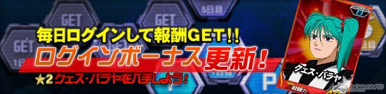 ゲームへログインすると、1日1回報酬がもらえるログインボーナスの報酬内容が更新され、新たにパイロットカード「★2 クェス・パラヤ」が追加された。
