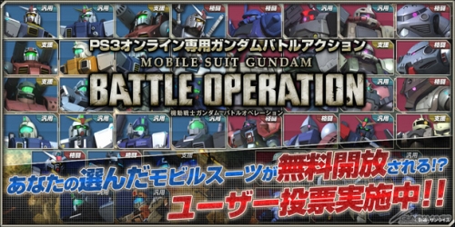 バンダイナムコゲームスより好評配信中のPS3専用オンラインバトルアクションゲーム「機動戦士ガンダム バトルオペレーション」では、本日3月3日(月)より「100万ダウンロード突破!ありがとうキャンペーン!」のひとつとして次回の無料開放モビルスーツを決定する「ユーザー投票」がスタートした。