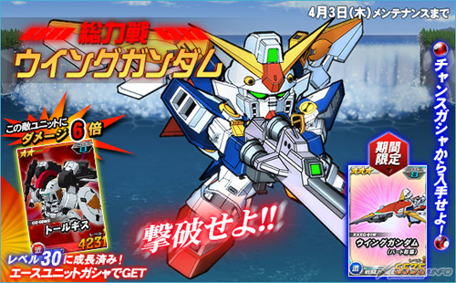 総力戦には4月3日(木)までの期間限定で「ウイングガンダム」が登場し、期間中に任務を実行すると、まれにエンカウントすることがある。