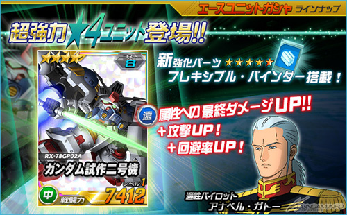 エースユニットガシャに新たに追加された「★4 ガンダム試作二号機」は、強化パーツ「フレキシブル・バインダー」を搭載した強力な機体となっている。