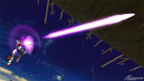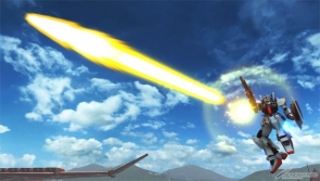 ▲メイン射撃「ビーム・ライフル」は発射時に盾を構える。盾展開中は機体前面に射撃バリアが張られるので、強気に撃っていくことができるぞ。