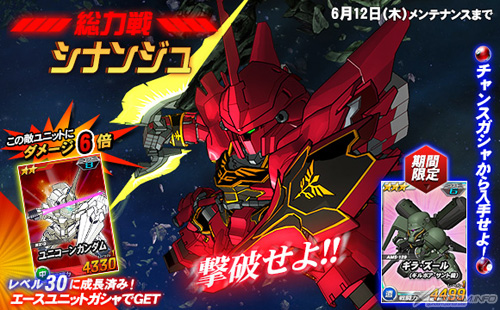 バンダイナムコオンラインが「Yahoo!ゲーム」にて提供中の基本無料ブラウザゲーム「SDガンダムオペレーションズ」では、本日5月29日(木)より「シナンジュ」が登場する総力戦がスタートした。
