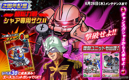 超総力戦には6月26日(木)までの期間限定で「シャア専用ザクII」が登場し、期間中に任務を実行すると、まれに遭遇することがある。