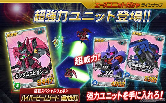 本日よりエースユニットガシャに、「★3 ガンダムエピオン(MS)」、「★3 高機動型ザクII(アナベル・ガトー専用)」、「★3 ザクI(ノリス・パッカード専用)」が登場するほか、プラチナパイロットガシャには「★3 ノリス・パッカード」、「★3 アナベル・ガトー」、「★3 ミリアルド・ピースクラフト」などが登場。こちらもあわせてチェックしよう。