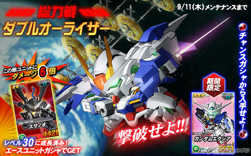 総力戦には9月11日(木)までの期間限定で「ダブルオーライザー」が登場し、期間中に任務を実行すると、まれに遭遇することがある。