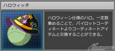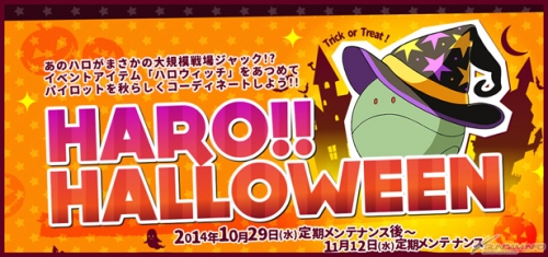 「HARO!!HALLOWEEN」イベントでは、期間中大規模戦に参戦し、戦闘評価に応じて獲得可能な「ハロウィッチ」を一定数集めることで、パイロットコーディネートアイテムと交換することができる。開催期間は11月12日(水)メンテナンス開始まで。