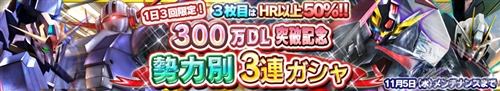 「勢力別3連ガシャ」は、これまでに登場した人気機体、パイロット、サポートを中心に構成された3連ガシャで、3枚目はHR以上が50%の高確率で出現する。