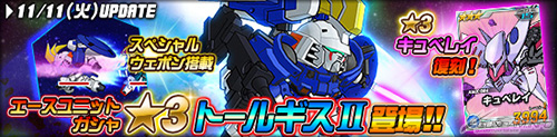 エースユニットガシャに「★3 トールギスII」、「★3 キュベレイ」、「★3 ザクIII」、「★3 オーバーフラッグ(MS)」、「★3 リック・ディアス(黒)」など、強力なユニットが多数登場する。