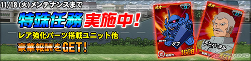 特殊任務「オペレーションチップ奪還作戦」では、期間限定のマップで登場する強力な敵を倒しオペレーションチップを獲得することが目標で、マップを進めることにより「★2 グフ」や「★2 ランバ・ラル」など強力な報酬を獲得することができる。