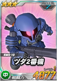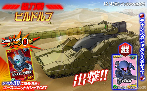 同機を倒した際に引くことができるチャンスガシャには「★3 ヅダ2番機」などを獲得できるチャンスがあるほか、エースユニットガシャには「ヒルドルブ」に対し6倍の攻撃力を発揮する「★2 ガンキャノン重装型」が追加される。