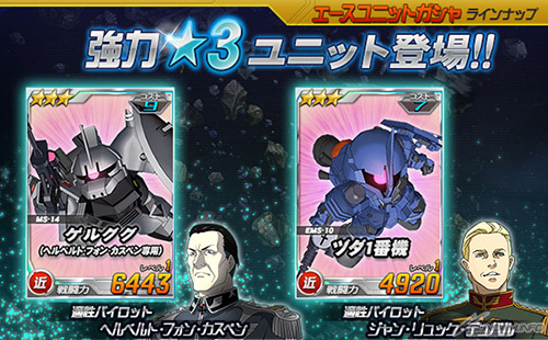 本日よりエースユニットガシャに「★3 ゲルググ(ヘルベルト・フォン・カスペン専用)」、「★3 ヅダ1番機」が登場。強力なユニットとなっているので、ぜひとも手に入れよう。