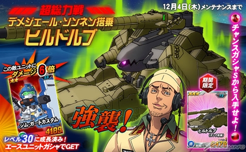 同機を倒した際に引くことができるチャンスガシャSには「★3 ヒルドルブ(タンク形態)」を獲得できるチャンスがあるほか、エースユニットガシャには「ソンネン搭乗ヒルドルブ」に対し6倍の攻撃力を発揮する「★2 ジム・ガードカスタム」が追加される。