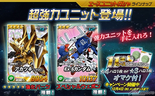 本日より、エースユニットガシャに「★4 アカツキ(シラヌイ)」と「★3 Ex-Sガンダム」が登場。「★4 アカツキ(シラヌイ)」は強化パーツとして「ヤタノカガミ」を、「★3 Ex-Sガンダム」はスペシャルウェポンとして「リフレクター・インコム」を搭載する強力な機体となっているので、ぜひとも手に入れよう。
