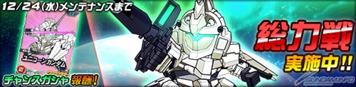 今回の総力戦では「ユニコーンガンダム」が登場し、12月24日(水)までの期間中に任務を実行すると、まれに遭遇することがある。