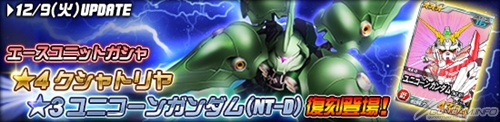 同機を倒した際に引くことができるチャンスガシャには「★3 ユニコーンガンダム」を獲得できるチャンスがあるほか、エースユニットガシャには「ユニコーンガンダム」に対し3倍の攻撃力を発揮する「★2 クシャトリヤ」が追加される。