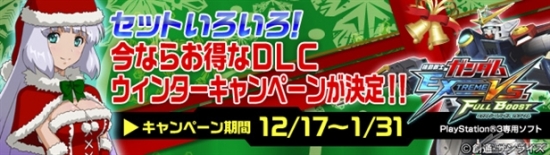 バンダイナムコゲームスより好評発売中のPS3専用ソフト「機動戦士ガンダム EXTREME VS. FULL BOOST」では、発売中の各種DLC(ダウンロードコンテンツ)をお得なセットで購入できるウインターキャンペーンが、12月17日(水)より期間限定で開催される。