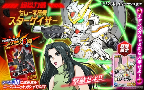 同機を倒した際に引くことができるチャンスガシャSには「★3 スターゲイザー」を獲得できるチャンスがあるほか、エースユニットガシャには「セレーネ搭乗スターゲイザー」に対し6倍の攻撃力を発揮する「★2 ストライクノワール」が追加される。